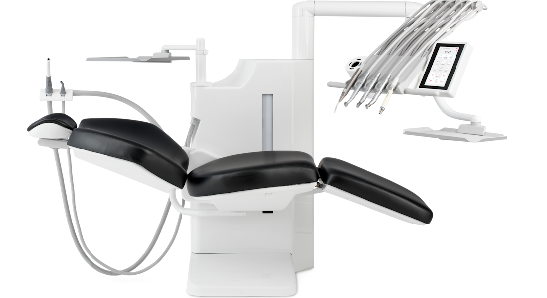 Ergonomie Praticien : Têtière orbitale à triple articulation assistée et dossier affiné pour une proximité optimale avec le patient.